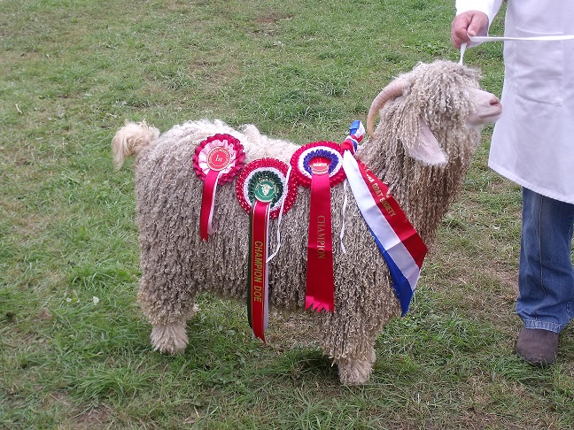 We first started keeping goats fifty years ago when angora goats became available in the UK we bought three embryos. Four doe kids were born and came to us when we moved to Wales in 1987. We had also purchased an imported buck kid before we moved which was quarantined. From these animals and the occasional purchase we now run about 30 goats. We decided to do a small diversification and to process our own mohair. They are shorn twice a year and the first time three of us together with our scissors carefully removed the fleeces of five goats! However, since that occasion they have been shorn the same way as the sheep. We select the best which we have spun and we sell the yarn both dyed and undyed in our small showroom together with garments and luxurious skins and cushions. The rest of our clip is sold through the small co-operative Mohair Marketing Board. We have goats for sale and are pleased to discuss your requirements with you.